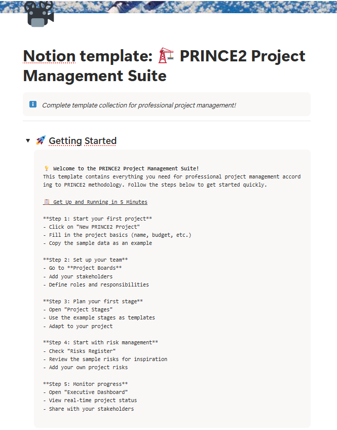 Large collection of Notion templates, for PRINCE2 project management. Get 20+ templates; dashboards; and several quick action buttons that update your databases in an instant.