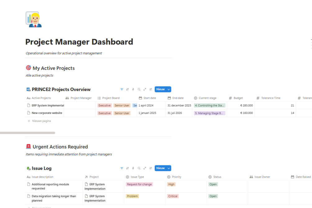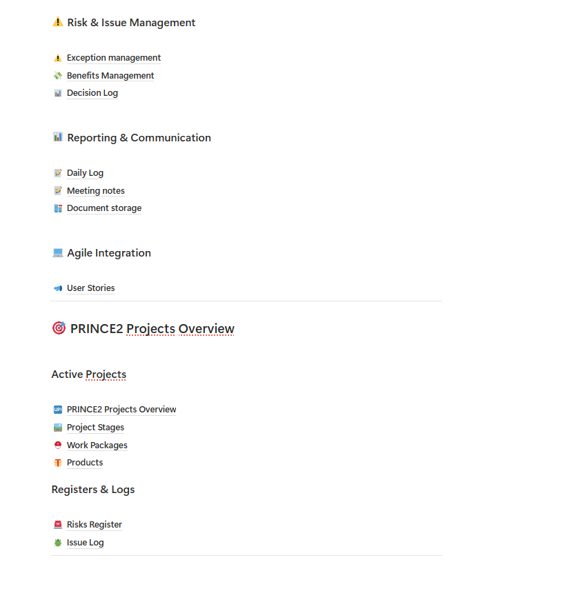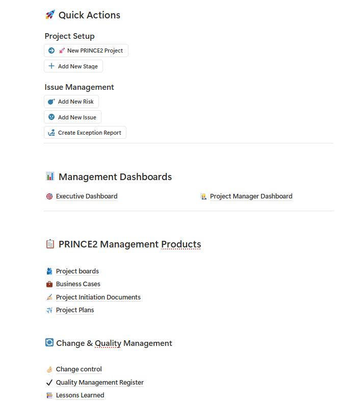 Large collection of Notion templates, for PRINCE2 project management. Get 20+ templates; dashboards; and several quick action buttons that update your databases in an instant.